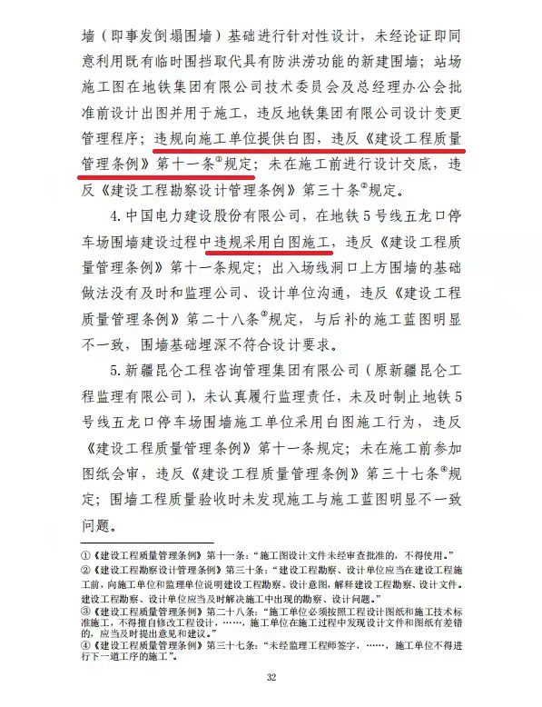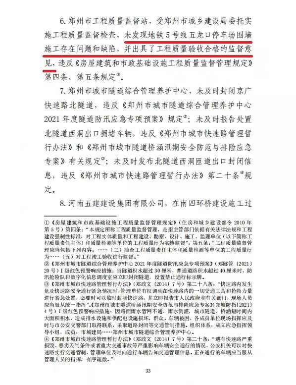 调查认定:这是一起由极端暴雨引发严重城市内涝,涝水冲毁停车场挡水围墙、灌入地铁隧道,造成14人死亡。郑州地铁集团有限公司擅自变更设计,未上报发改委审核,设计单位违规向施工单位提供白图,郑州地铁集团有限公司违规同意采用白图施工,施工单位违规采用白图施工,质监站未发现问题和缺陷,并出具了工程质量验收合格的监督意见。郑州市雨水管道仅2400余公里,196.3亿海绵投资,实际与海绵城市相关的仅占32%,用于景观、绿化等占近56%。