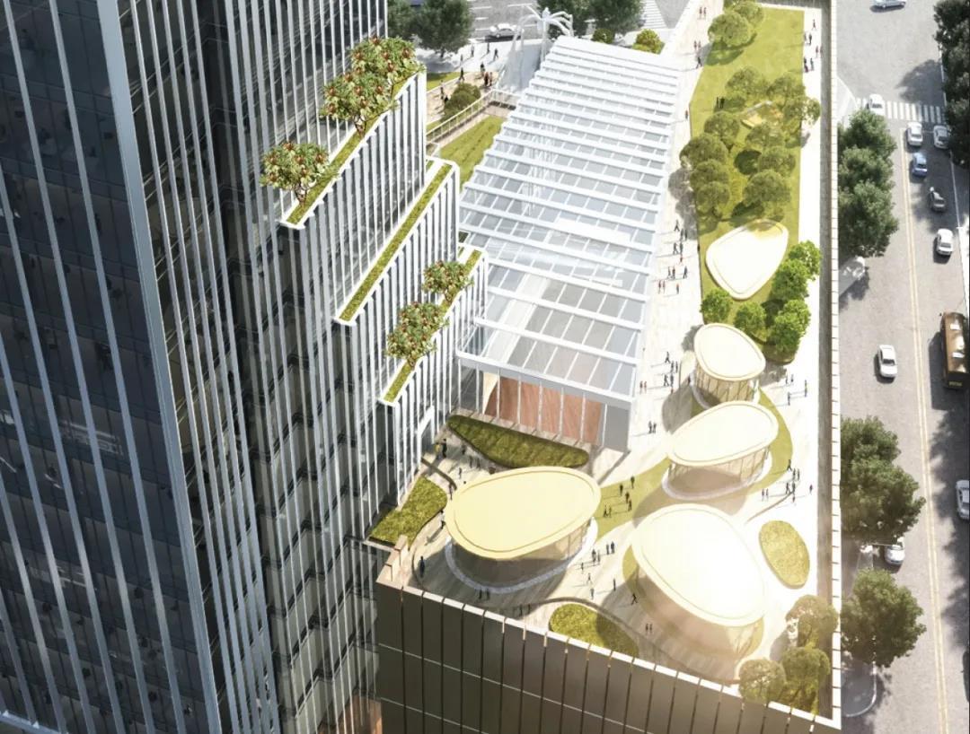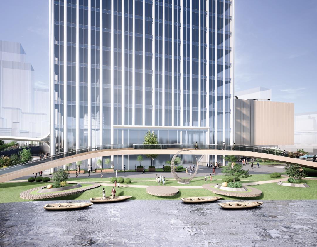 上海新金环广场设计竞赛方案将城市以及文化与生态融合,打造具有山水诗意的购物休闲空间,同时保留文化地标,并融合智慧办公与智创发展,标志着未来建筑所需要的“绿色智慧”。